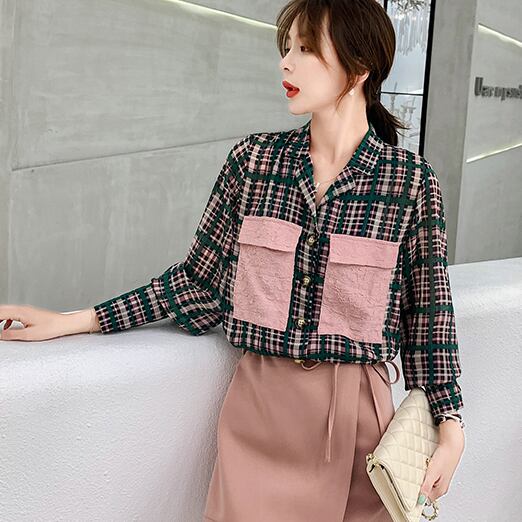 チェック柄 チェックシャツ シャツ べっ甲ボタン ビッグポケット 抜き襟 大人 レトロ ガーリー カジュアル ナチュラル 可愛い お出かけ お買い物 デート 春 秋 レディース
