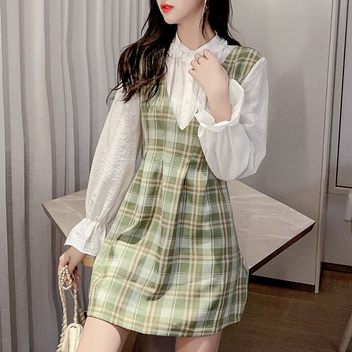 全2色 コーデ風 ドッキングワンピース チェック チェック柄 ワンピース キャンディスリーブ ブラウス シャツ Vネック ひざ丈 レディース ガーリー レトロ 可愛い お出かけ お買い物 デート 女子会 春 秋