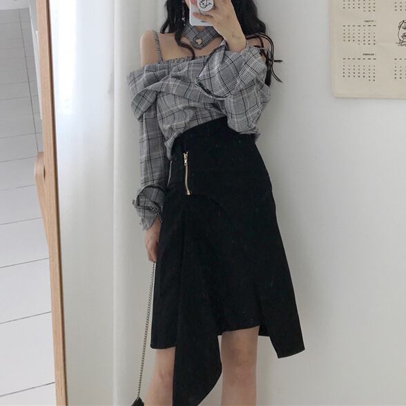 チョーカー付き!チェック柄オフショルダーブラウスです。