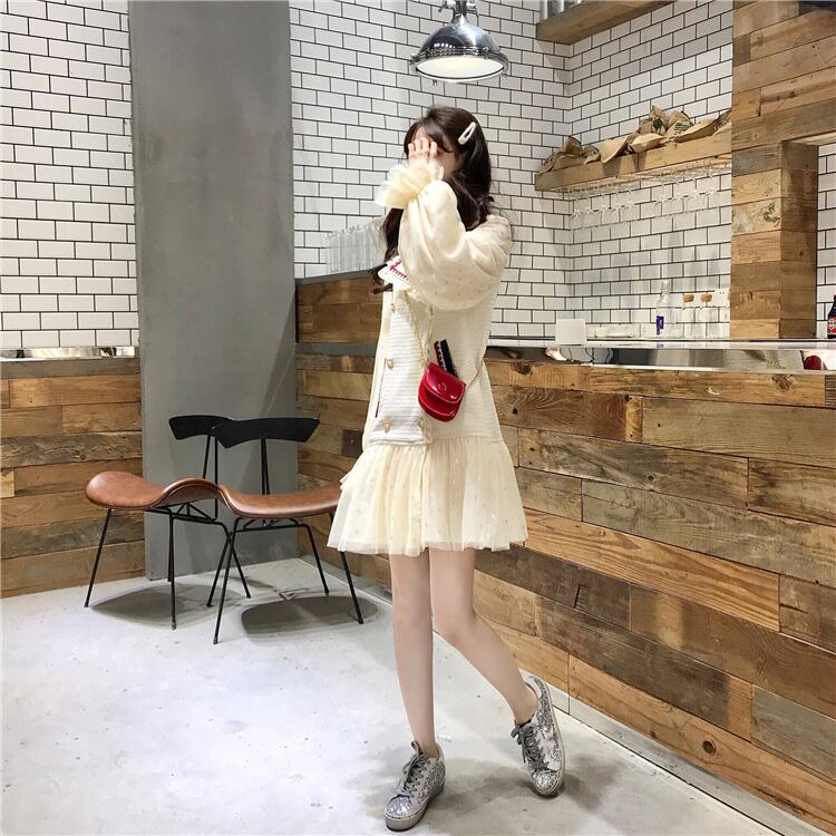 袖や裾にはオーロラのドットが散りばめられ、フロントはコート風デザイン。