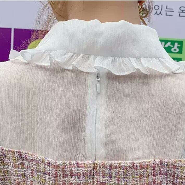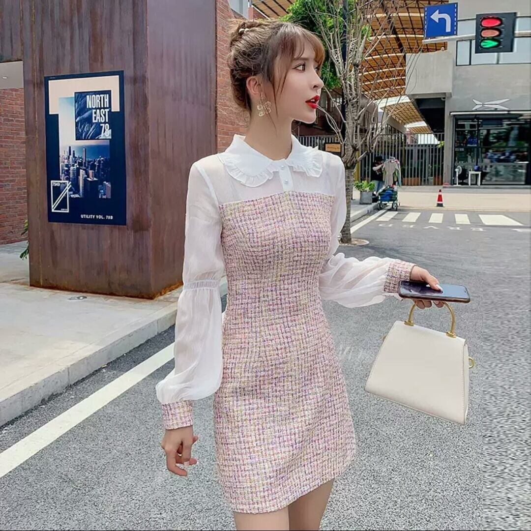 ランタンスリーブ シフォン ツイード ショート丈 ワンピース 長袖 大人 キレイめ 可愛い エレガント 上品 お呼ばれ お出かけ お買い物 デート 女子会 春 夏 通学 学生 通勤 韓国ファッション