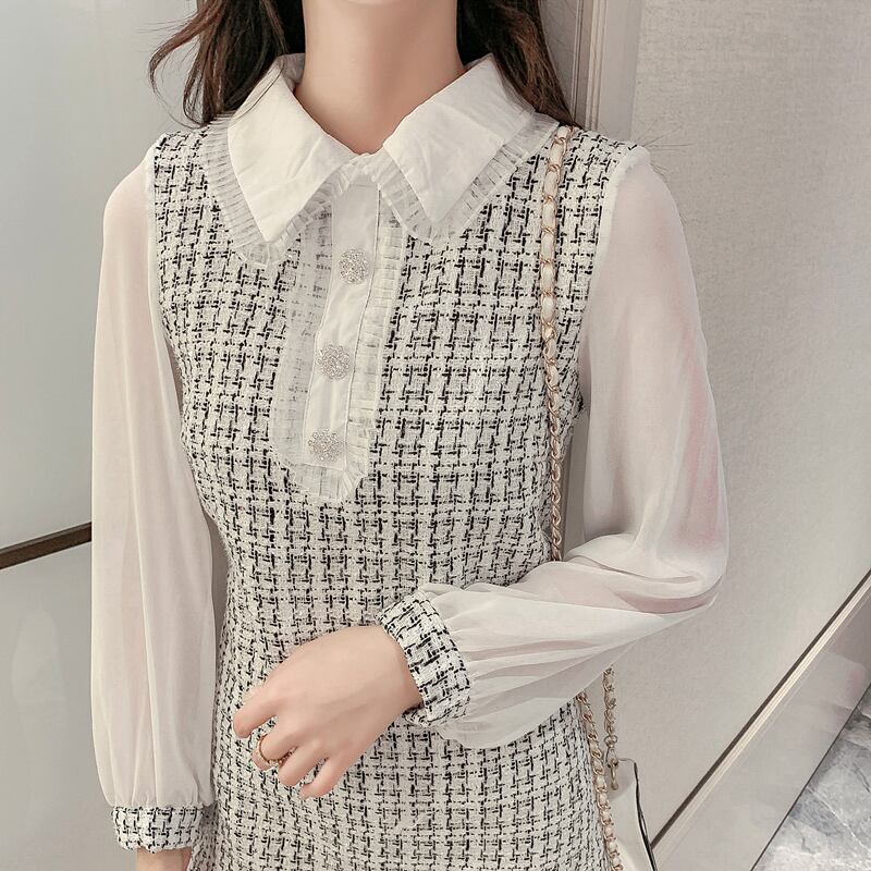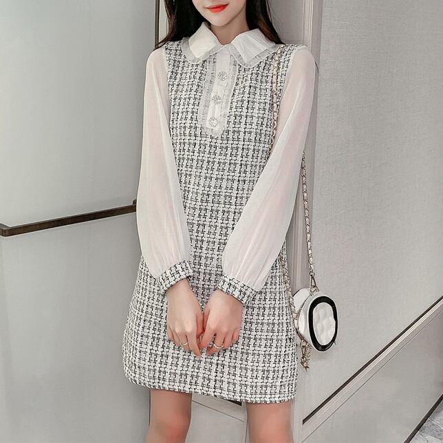 全2色 ツイード ワンピース シースルー 襟付き Aライン ワンピース ミニ丈 ひざ丈 レディース 可愛い レトロ ガーリー エレガント フォーマル お出かけ お買い物 デート 女子会 春 秋