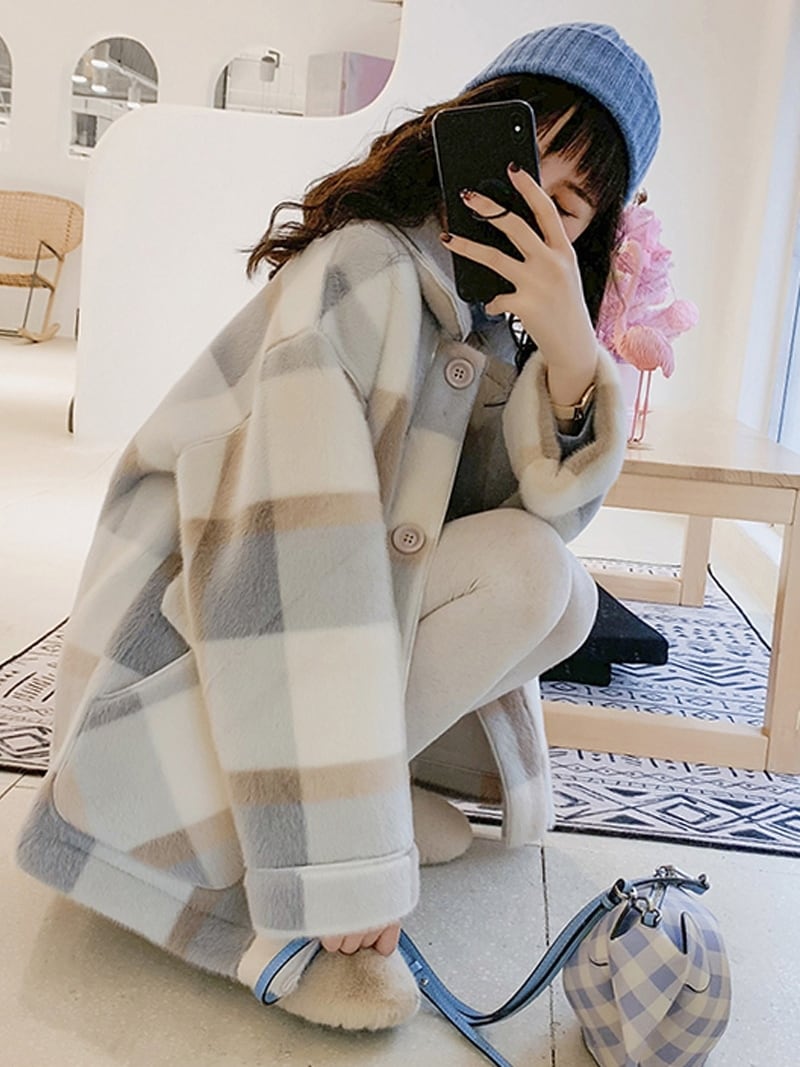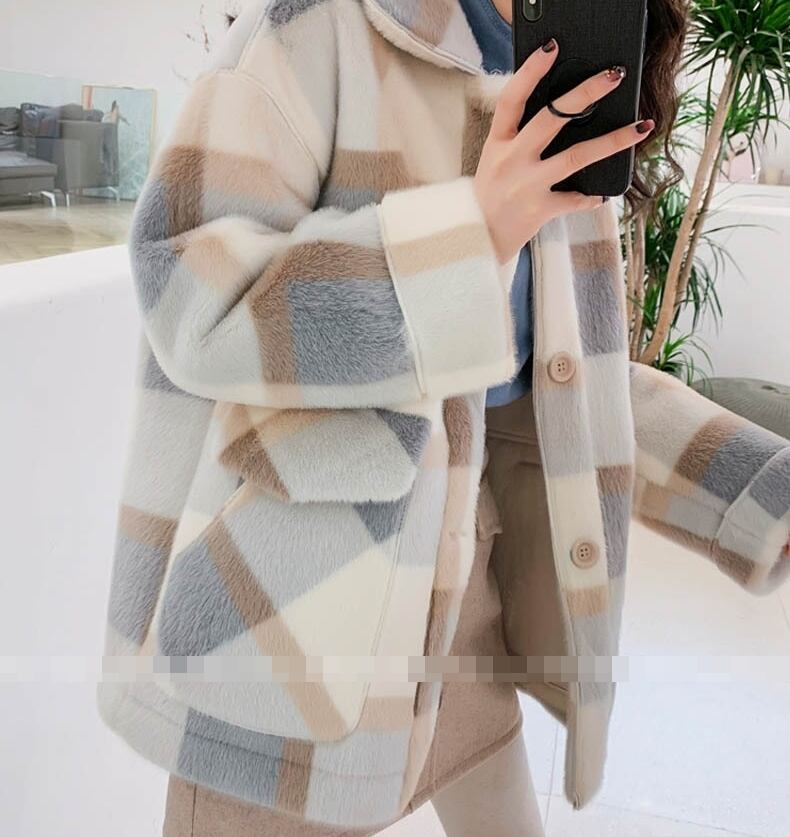 全2色 チェック柄 ボアジャケット ファージャケット コート ポケット カジュアル デイリー 可愛い ふわふわ あったか お出かけ ボタン デート パステルカラー 秋 冬