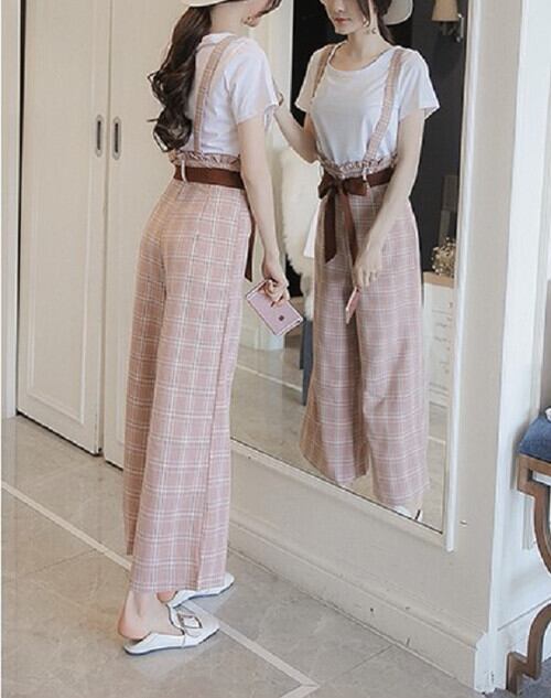 全2色 オールインワン サロペット サスペンダーパンツ ワイドパンツ 九分丈 シンプル ゆったり チェック きれいめ カジュアル デート リゾート 通学 デイリー 普段着 夏 グレー ピンク